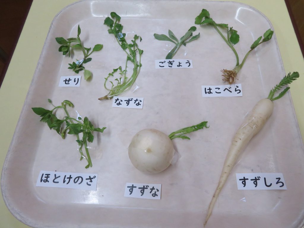 七草は、「セリ ナズナ ゴギョウ ハコベラ ホトケノザ スズナ スズシロ」です。