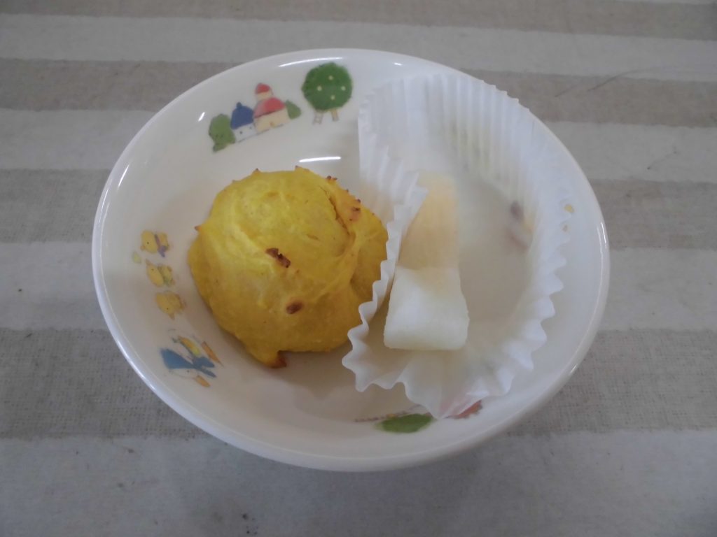 この日のおやつは お月さまに見立てて「かぼちゃパン」でした