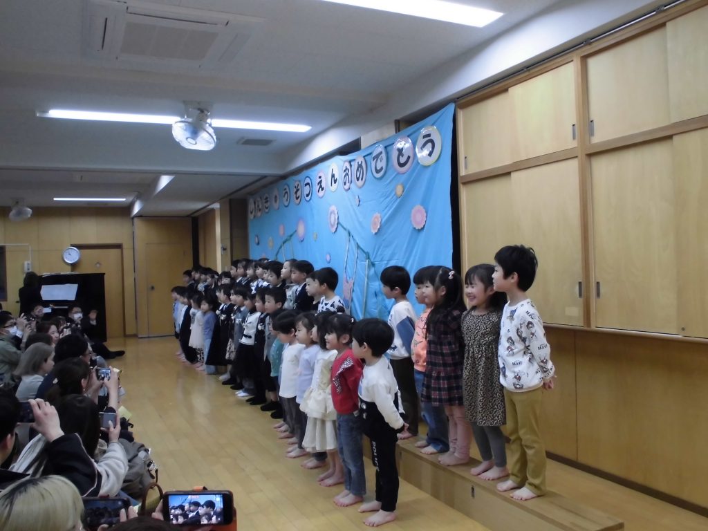 第Ⅰ部は進級式で0歳児クラス~4歳児クラスは大きくなったねと歌をうたったり次は何歳児クラスになるのかなどの発表をしました。