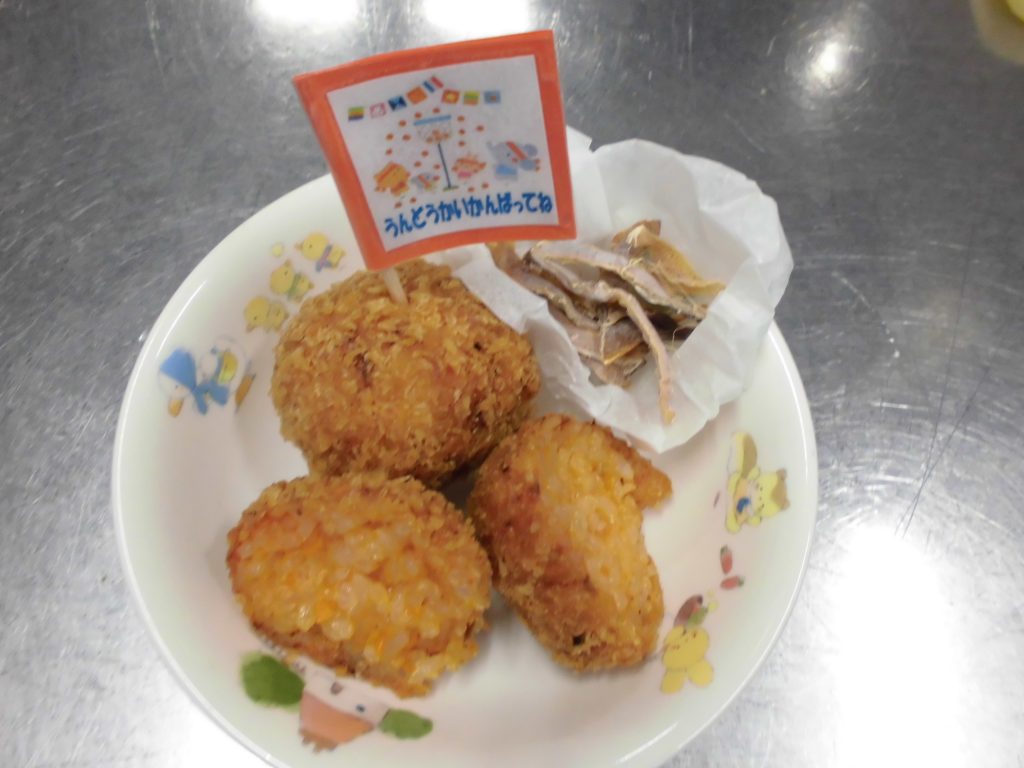 うんどう会の前日10月10日(金)のおやつは、給食室より「うんどうかいがんばってね!」の思いを込めて、