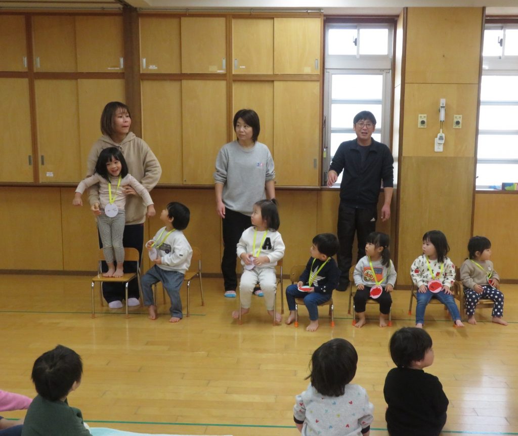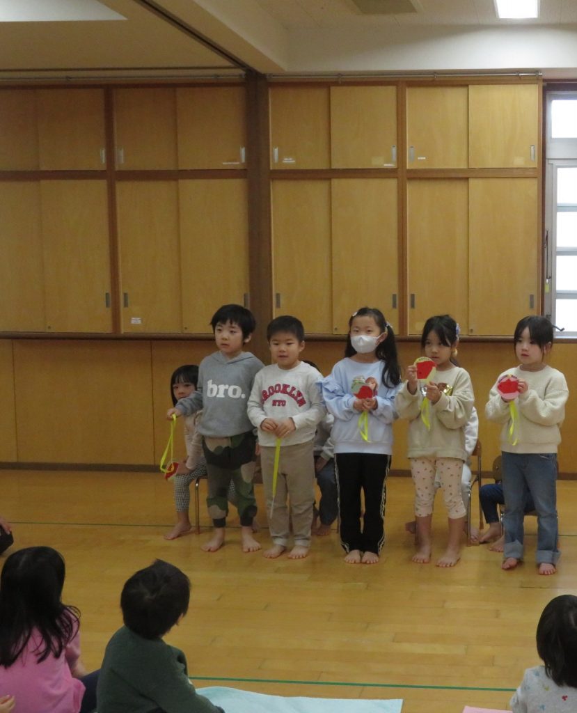 ホールに全クラスが集まり、1月生まれのお友達( 8 名 )の紹介と5歳児から誕生日メダルをかけてもらいましたよ。