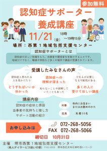 地域で増やす活動を行っています。11月21日 18時~ 認知症サポーター養成講座を開催します。