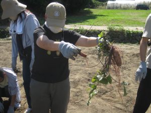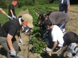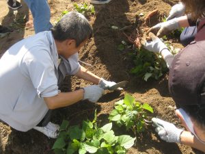 さつま芋畑では、スコップを手に持ち戸惑う人もいましたが、慣れている人が見本を見せながら、