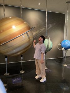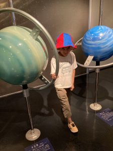 惑星の模型かっこいいなあ♪と一緒に写真撮影。